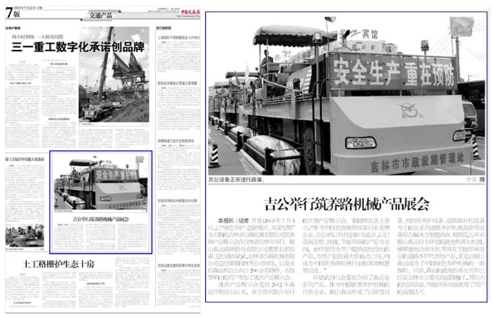 展示會(huì)得到諸多網(wǎng)絡(luò)媒體紛紛報(bào)道的同時(shí),主流媒體平臺(tái)《中國(guó)交通報(bào)》也于2013年7月22日第七版對(duì)此次展會(huì)進(jìn)行了報(bào)道,高度肯定了森遠(yuǎn)、吉公在綠色筑養(yǎng)路行業(yè)新發(fā)展形勢(shì)下的旗幟作用,充分見(jiàn)證了森遠(yuǎn)、吉公以諸多代表性產(chǎn)品服務(wù)市政道路建設(shè)、贏得行業(yè)市場(chǎng)、獲得用戶認(rèn)可的不爭(zhēng)事實(shí)。
